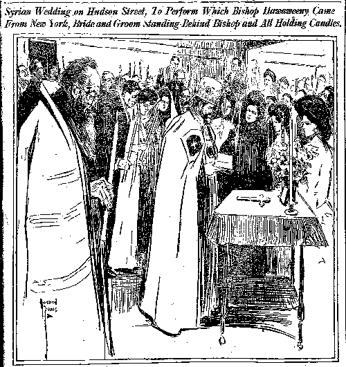 The home was filled with guests who “reverently greeted the Bishop and kissed his hand”. In the middle of the double parlor a lace covered table was set with two candle stands, a vase of flowers, an Icon and a cross. The newspaper reporter was quite exact in his description of the ceremony, most likely the first Orthodox marriage service he ever witnessed. He brought with him a sketch artist to record the event. Bishop Raphael is described as wearing a “long robe of royal purple lined with green silk”. His crown was “studded with precious stones and decorated with miniature enamel paintings”. The gold cross he wore was “received from the Czar” and contained a “relic of the true Cross”. He describes Fr. George Maloof as being vested in a “brilliant robe of gold and silk”.