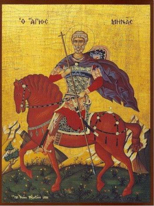 The Holy Great Martyr Menas (Mēnás), an Egyptian by birth, was a military officer and served in the Kotyaeion region of Phrygia under the centurion Firmilian during the reign of Emperors Diocletian (284-305) and Maximian (305-311). He was praised and admired for his bravery in battle, his patience, and his self-discipline.